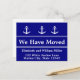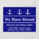 Three white boat anchors are at the top of this navy blue postcard. The centre has white text for you to personalise. (Display text: We Have Moved) At the bottom, there's white text for your name and new address.