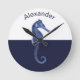 Custom Nautical Seahorse Navy Blue Ocean Beach Round Clock by Sandy Closs