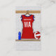 A unique design for the netball player or netball fan with a netball uniform hanging up in a sports changing room in red with blue and white trim. The name and netball position can be customised for the netball player. A netball and water bottle is next to the netball uniform. This personalised design can be created in any colour combination for the netball star in your family. Contact us through our GiftsBonanaza store with your request. sgb01