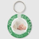 Round button keychain features your favourite photo surrounded with white leaves, berries and dots on a textured green background. TIP: Upload a high resolution photo that features your baby in the middle - you can crop to a square, too. Keychains make memorable gifts for family, grandparents and friends or create for yourself.