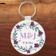 Lavender and violet flowers wreath with personalized monograms and wedding date keychain. Fun little wedding favor decorated with a beautiful floral wreath. Cute and practical item that celebrates your love.