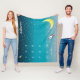 A special personalised baby blanket in an outer space theme in ombre blue teal and white. Modern typography with a space shuttle, flying saucer, stars and moon.