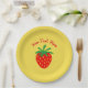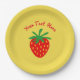 Custom paper party plate with red strawberry design. Cute party accessories with fruity print. Yellow green and red colours. Add your own personalised text. Great for kids Birthday, wedding, dinner party etc. Available in different sizes fro serving homemade cake, sweets, pastry food, desserts and more.