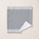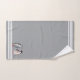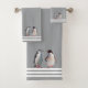 Three white stripes on light silver grey and custom penguin couple image. Elegant modern towel set.