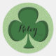 Your name, family name, or custom text in script lettering on stylish green Irish shamrock stickers. Shown is the editable sample name, Riley. Text is fully customisable, including colour, size, and style. Use these personalised Irish themed stickers as envelope seals for family correspondence or an Irish wedding, or to give to teachers, students, and children for St. Patrick's Day. Designed by 369MyName.
