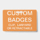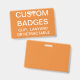 Custom printed personalised 3.38" x 2.13" BADGE Blank Template (with ORANGE Background - change to any colour). Design, create, make your own. Your photo, image, text, logo, graphics in full colour edge-to-edge print on the front and the back - horizontal or vertical designs. Made of PVC plastic, durable, won't fade or tear. Available with Lanyard, Metal Clip, Retractable Clip, or Badge Only.