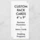 Custom printed personalised 9" x 4" RACK CARD Blank Template. Design, create, make your own rack cards, menu cards, wedding programs, promotional hand-outs. Your photo, image, text, logo in high quality, full-bleed, full colour print on both sides of the rack card. 4"l x 9"w (portrait) or 9"l x 4"w (landscape) 100 lb. white card stock with a gloss finish.