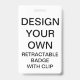 Custom printed personalised 2.13" x 3.38" PORTRAIT RETRACTABLE BADGE WITH CLIP Blank Template. Design, create, make your own. Your photo, image, text, logo, graphics in full colour edge-to-edge print on the front and the back, horizontal or vertical. Made of PVC plastic, durable, won't fade or tear. Retractable, Metal Clip, Lanyard Necklace, or Just Badge. Best for office and business identity use, expos, exhibitions, conferences and corporate events.