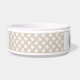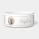 Destei's beautiful design featuring a personalizable pet photo template with a white dog paw pattern on a beige background colour. Personalise by changing the sample Golden Retriever puppy photo to a photograph of your own pet. Also edit the personalizable text area with the name of your pet. The custom photo is displayed through a round frame that has soft edges allowing for the photo to be seen through it. Next to the custom photo there is a personalizable text area for a name or other custom text. The top and bottom have a thin beige colour border. If you would like to change the beige colour to any other colour, please enter the design tool to do it. This lovely design is great for pet owners who are looking for a food or water bowl for their pet with a personalised touch.