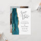 This elegant modern save the date card features a teal blue watercolor agate border trimmed with faux gold glitter. The charcoal grey text appears on a white background. Easily replace the sample image on the reverse side with a vertical photo of the future bride and groom.