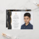 The left-hand edge of this elegant modern first communion invitation features a black watercolor agate border trimmed with faux gold glitter. A faux gold foil cross appears above the customisable text, which combines handwriting, copperplate and italic fonts in charcoal grey on a white background. Easily replace the sample image with a photo of your child. The reverse side features a matching black and gold agate design.