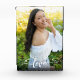 “Love.” A fun, playful visual of white script handwriting and cute, playful hearts against the photo of your choice, helps keep love in your heart every day. Spread happiness and joy whenever you gaze at this stylish and modern, sweet custom photo block. Easily personalise with a photo of your loved one. A great keepsake gift for your own home or for your relatives.