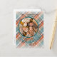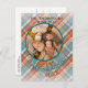 Unique, classic, cute and decorative Holiday season greeting card. With fun Happy Thanksgiving wish on a cosy warm colourful teal blue and orange red coloured plaid tartan pattern. With room to customise or personalise with your own cheerful photo and family name on the front of the card, and a customisable season greeting poem on the backside of the card with room for family member names.