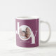 This modern Christmas Holiday Photo Mug is decorated with the word JOY in white on a purple plum background.