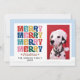 This is a fun and festive Christmas card with large, colourful letters that spell “MERRY” repeatedly in bold, playful font. Next to the bright text is a space where you can add your own picture—whether it's a family photo or your pet in a Santa hat. Underneath, there’s a spot to personalise the card with your family name and the year. The background is light blue with small white snowflakes, giving it a wintry feel. It’s a cheerful and easy-to-read design, perfect for sharing some holiday joy with a personal touch!