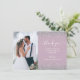 Customise this elegant wedding thank-you card with your vertical wedding photo on the left. The words "thank you" appear on the left in white handwriting script with flourishes at the beginning and end. Add a message of your choice in white italic text on a dusty lilac background with silver faux glitter borders. Add your first names and wedding date on the reverse over a pale lilac ampersand.