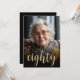 The front of this 80th birthday invitation features the guest of honour's photo with a gold-coloured text overlay. The word "eighty" appears in elegant gold-coloured calligraphy script. A dark screen helps make the text pop. Customise the reverse side with the name and party details on a black background. A great way to celebrate someone who's turning eighty!