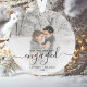 Commemorate your engagement with this beautiful modern keepsake ornament. The grey text reads "Our first Christmas engaged," with the word "engaged" in elegant handwriting script with flourishes before and after. Replace the sample image with your favourite photo, and add your names and the year. A white gradient filter helps make the text pop.