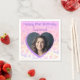 Make any special occasion fun with a heart shaped photo and message on a napkin with a pink purple and orange linked heart pattern background. Replace the placeholder photograph with your photo. A square photo with subject centred within the square works best. Personalise the template fields, remove text or use the edit design tool to select a font style, size, and colour you prefer. The design can also serve for any birthday, graduation or bridal shower just to name a few special occasions.