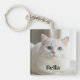 Custom photo keychain with cute white kitty cat. Add your image here. Make your own keychain with your design, company logo or photograph. Upload your picture to this template to see how it looks. Create your own with photography of wedding, family portrait, pet cat or dog etc. Cute DIY gift idea for men women and kids. One sided. Pretty cat with blue eyes.