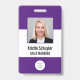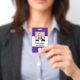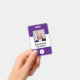 This badge features a simple, modern purple and white background for a professional look. Customise it with your square photo, name, job title, logo, company name, address or other information, and optional barcode.