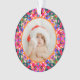 Custom Photo Merry Christmas Modern Colorful Tree Ornament. A festive, jolly and bright Christmas pattern decoration for your holiday home. Add your own two photos to celebrate family memories. For budget friendly maximalist Christmas home decor presents. In traditional, warm Christmas colors of red, pink and orange, with winter green and blue. Makes a great, budget friendly gift for her.