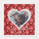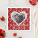 These custom napkins feature a Valentine love or wedding theme with a photograph heart frame. The background is a red cushion pattern with diamonds, and silver mosaic frame. A sample photo of a married or engaged couple is placed in the centre.