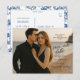 Looking for a stylish way to announce your wedding? This customisable photo save-the-date postcard lets you upload your favourite engagement photo while keeping the design polished and modern. Featuring elegant type placement that suits darker clothing and beach settings, the reverse side showcases a timeless chinoiserie blue pattern for a classic finish. Perfect for coastal weddings, modern couples, or anyone who wants a refined and personal touch.