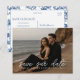 Looking for a stylish way to announce your wedding? This customisable photo save-the-date postcard lets you upload your favourite engagement photo while keeping the design polished and modern. Featuring elegant type placement that suits darker clothing and beach settings, the reverse side showcases a timeless chinoiserie blue pattern for a classic finish. Perfect for coastal weddings, modern couples, or anyone who wants a refined and personal touch.