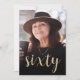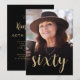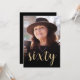 The front of this 60th birthday invitation features the guest of honour's photo with a gold-coloured text overlay. The word "sixty" appears in elegant gold-coloured calligraphy script. A dark screen helps make the text pop. Customise the reverse side with the name and party details on a black background. A great way to celebrate someone who's turning sixty!