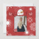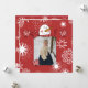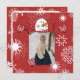 A happy snowman with a carrot nose and red stripe scarf, lots of snowflakes on a festive red background, an area you can add a photo, and areas to add your personal holiday message and name on Snowman holiday greeting cards all your friends are sure to love!