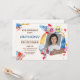 This cute invitation features an astronaut, a rocket ship, an alien, and planets. Add your child’s photo