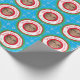 This festive, custom Christmas themed wrapping paper features a soft blue coloured background with crystal blue snowflakes. A sample photo is tiled across the wrapping paper with an outer green frame, followed by a red and white peppermint candy cane pattern frame. The message "Special Delivery from Santa" is printed at the top in a whimsical red font. A sample name is printed at the bottom in green. A photograph is placed in the centre which you can replace with your own child's photo or custom image.