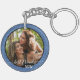 Unique key chain to customise or personalise with a THEN and a NOW photo of best friends or siblings, on a faux blue denim jeans textile weave pattern background. Fun Friendship Day, birthday or keepsake gift for your best friend, sister or brother, mum or dad.