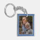 Unique key chain to customise or personalise with a THEN and a NOW photo of best friends or siblings, on a faux blue denim jeans textile weave pattern background. Fun Friendship Day, birthday or keepsake gift for your best friend, sister or brother, mum or dad.