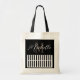 Custom Black and white grand piano keys tote bag for teacher and students. Elegant monogram design with stylish typography and personalised name initial letter. Cute gift idea for pianist, piano instructor, piano player, musician, music school lessons etc. Classical instrument accessory for men women and kids. Monogrammed keyboard design.