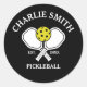 This personalised pickleball team Sticker features a bold black background with two crossed white paddles and a bright yellow pickleball at the centre. The sporty design includes editable text for your team name, established year, and club location. Perfect for team spirit, tournament giveaways, or personalised gifts for players and fans alike.