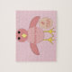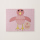 This awesome puzzle features a cute cartoon of a pink chick. The chick has a pale pink belly and darker pink wings and head with a yellow beak and feet. Next to the chick is a small egg.