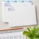 A custom return address envelope with blue script letters and covered in polka dots and circles, in light and dark blues on the back and the inside lining.
