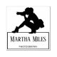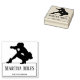 Lady photographer custom photography rubber stamp. Lovely professional photography logo featuring a silhouette illustration of a female photographer at work. The design includes two lines of custom text. Larger text is meant for your name and the smaller can hold your profession or custom contact information like phone number or social media handle.