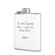The flask itself is fine. It’s a cheap flask, obviously bought in bulk, however am prepared to overlook that. Given that it is a personalized item, I would have liked to have seen gift boxing instead of the generic packaging. Terrible printing, and/or quality. It’s a cheap, tacky vinyl. It is not cut straight and is also applied in a way that it is overhanging the bottom, causing the glue to catch on items and it will eventually roll and tear, damaging the wrap.