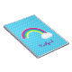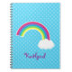 A bright rainbow with a cloud on one end, is on a teal blue background with light polka dots. Personalise it with your name.