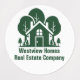 This forest real estate company label is perfectly customised for a realtor who specialised in houses near the wilderness or woodlands. The green silhouette of trees behind a log cabin home and personalised with your agent and realty business name for marketing labels in the backwoods.