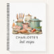 A personalised best recipes notebook with recipe template pages, featuring whimsical cook's table with cooking pots, pans, and utensils on the cover. A great gift for a the creative cook in your family! Simply add your name. You may also change the wording under your name and on the spine, whether your theme is as a cook or baker. You may choose from soft or hard cover.