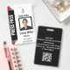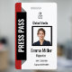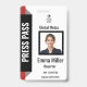 Professional red and black press ID badge with space for your photo, name, title, company logo, and barcode. Perfect for media, journalists, photographers, event staff, and corporate press passes. A customisable template for news, production crews, and special events.