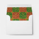 Custom return address A2 response envelopes with an elegant red and green Christmas tile design with a vintage gothic, fleur-de-lis pattern in golds restored from antique tiles.