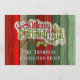 Beautiful, unique, classic, trendy, pretty and decorative Christmas holiday greeting card with a classic Holiday dark red, forest green, and white coloured 'Merry Christmas' quote text on a rustic weathered wooden country cottage farmhouse style planks pattern background. With room to easily customise or personalise with your company or family name, and room on the backside to write or print your own Holiday wish.
