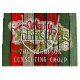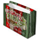 Beautiful, unique, classic, trendy, pretty and decorative Christmas gift bag with a classic Holiday dark red, forest green, and white coloured 'Merry Christmas' quote text on a rustic weathered wooden country cottage farmhouse style planks pattern background. With room to easily customise or personalise with your company or family name.