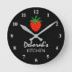 Custom round kitchen wall clock with red strawberry logo and black background color. Simple healthy food design with stylish typography template. Add your own name, monogram, logo or funny quote / saying. Elegant gift idea for dietician, nutritionist, new home, restaurant, cafe, diner, dinner party, business, company, shop, store, market, farm etc. Personalized home decor ideas and decorations.