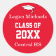 Bold graduation sticker that features the school colours of red and white. The graduate's names is written just below the graduation cap. Class of and the graduation year are written in an athletic lettering font and the name of the high school is just below. Looks great on graduation announcements, party favours and graduation party invitations.